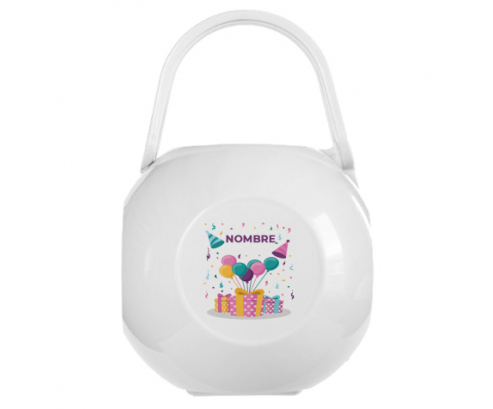 Caja portachupetes personalizado: Feliz cumpleaños estilo 5 - nombre , con estampado a color y que completa toda la gama ( Chupete, Pinza para chupete, Babero, Botitas, Bodies , Caja portachupetes y gorro).