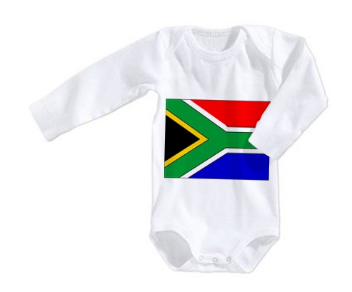 Body personalizado de Bandera Sudáfrica con estampado de colores, en algodón con escote americano cruzado y manga corta o larga. Se cierran con botones a presión en la entrepierna para facilitar el cambio. Los bodis son la pieza fundamental del primer vestidor del bebé, especialmente los personalizados. ¡Aprovéchate de comodidad y suavidad para tu bebé enamorándote de este magnífico body de manga larga o corta!, 100% algodón.