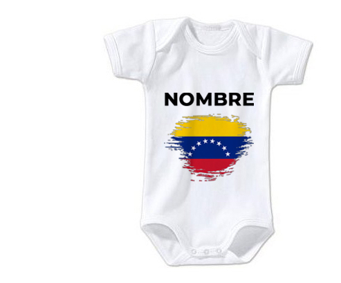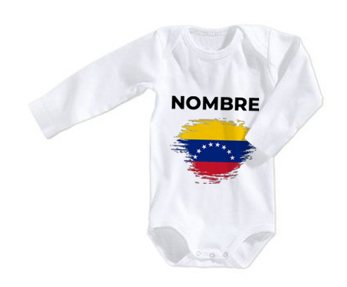 Body personalizado de flag Venezuela efecto cepillo con nombre con estampado de colores, en algodón con escote americano cruzado y manga corta o larga. Se cierran con botones a presión en la entrepierna para facilitar el cambio. Los bodis son la pieza fundamental del primer vestidor del bebé, especialmente los personalizados. ¡Aprovéchate de comodidad y suavidad para tu bebé enamorándote de este magnífico body de manga larga o corta!, 100% algodón.