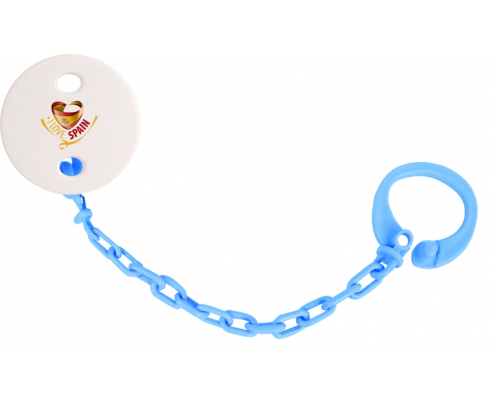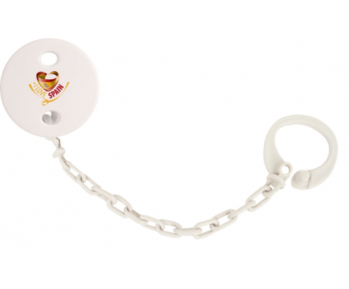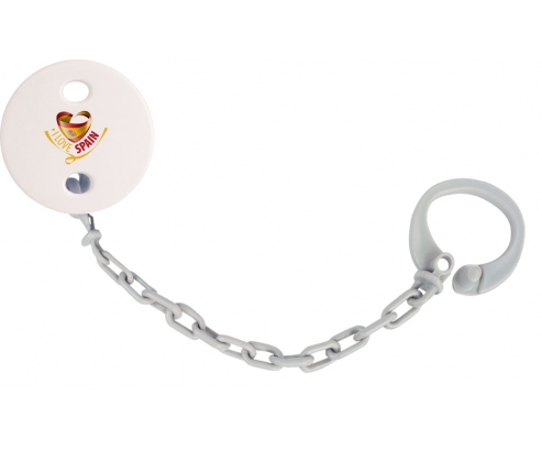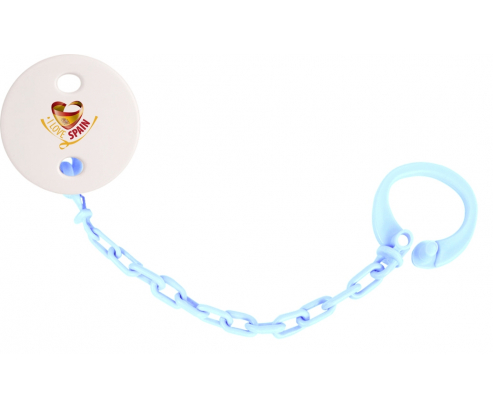 Chupetero personalizado I Love Spain con diseño personalizado en color. Disponible en varios colores y plástico fácil de lavar. Práctico: permite sujetar fácilmente el chupete del bebé a su peluche y ropa con un solo clip. Higiénico: evita que el chupete se caiga al suelo y así permite que el bebé tenga un chupete limpio todo el día Visible: fácil de detectar gracias a los patrones de colores.