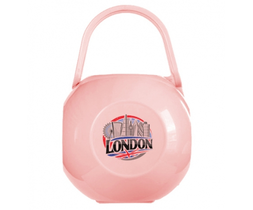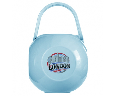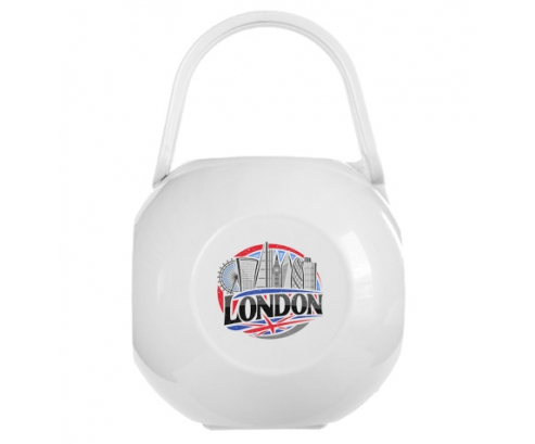 Caja portachupetes personalizado: Juguetes de la Ciudad de Londres , con estampado a color y que completa toda la gama ( Chupete, Pinza para chupete, Babero, Botitas, Bodies , Caja portachupetes y gorro).